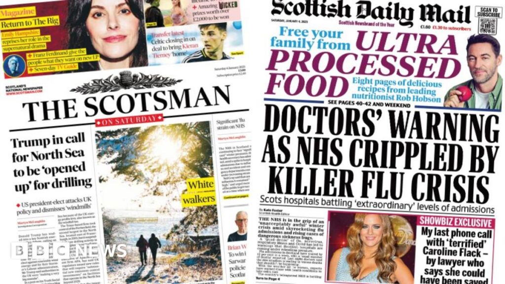 Share Twitter Facebook LinkedIn Email A review of the front page stories as flu rates rise across Scotland and Trump makes North Sea demandRead More