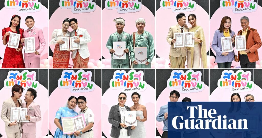 Share Twitter Facebook LinkedIn Email Thailand has become the first country in south-east Asia to hold legal same-sex weddings, with LGBTQ+ groups aiming to mark the occasion with more than 1,000 marriage registrations in a single dayRead More
