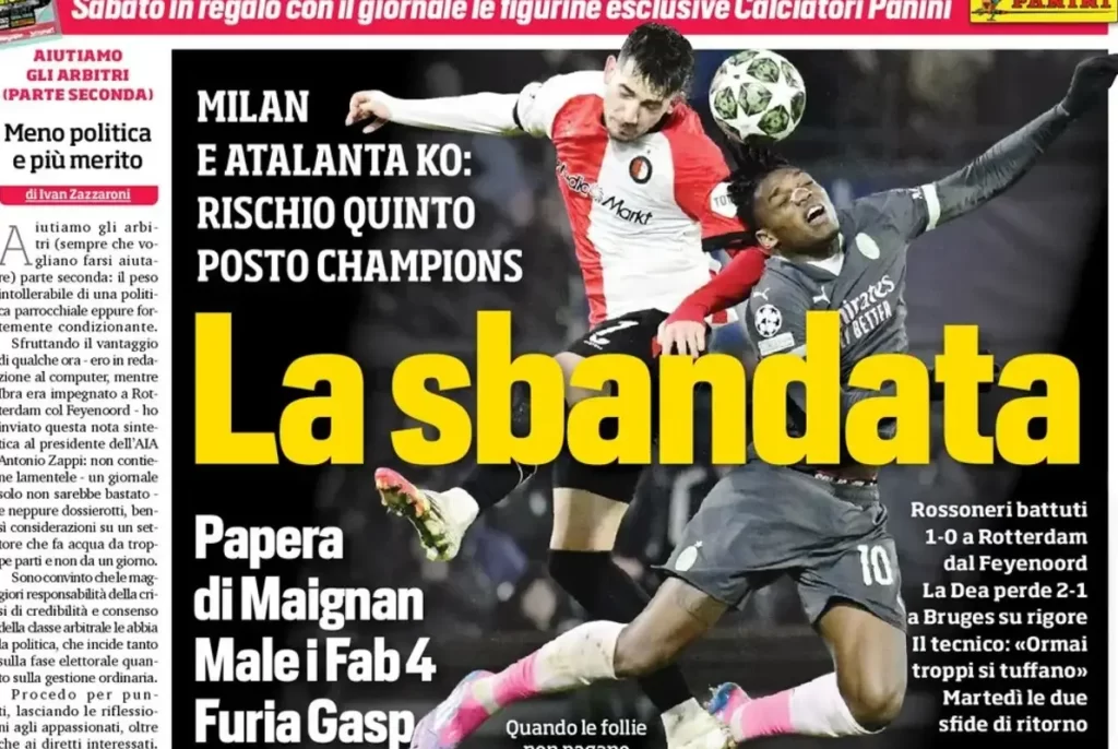 Share Twitter Facebook LinkedIn Email La Gazzetta dello Sport Milan, what a mess Champions League, rough KO in HollandMaignan gaffe, The four stars stay unlit, Feyenoord win, now it’s difficult in San SiroScandal It’s not a penalty…Read More