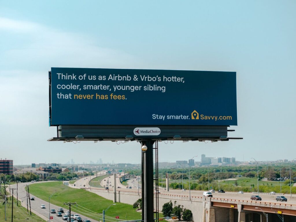 Share Twitter Facebook LinkedIn Email Savvy, a Texas-based platform that promises no fees for hosts and guests, took aim at bigger rivals Airbnb and Vrbo with a new billboard.Read More