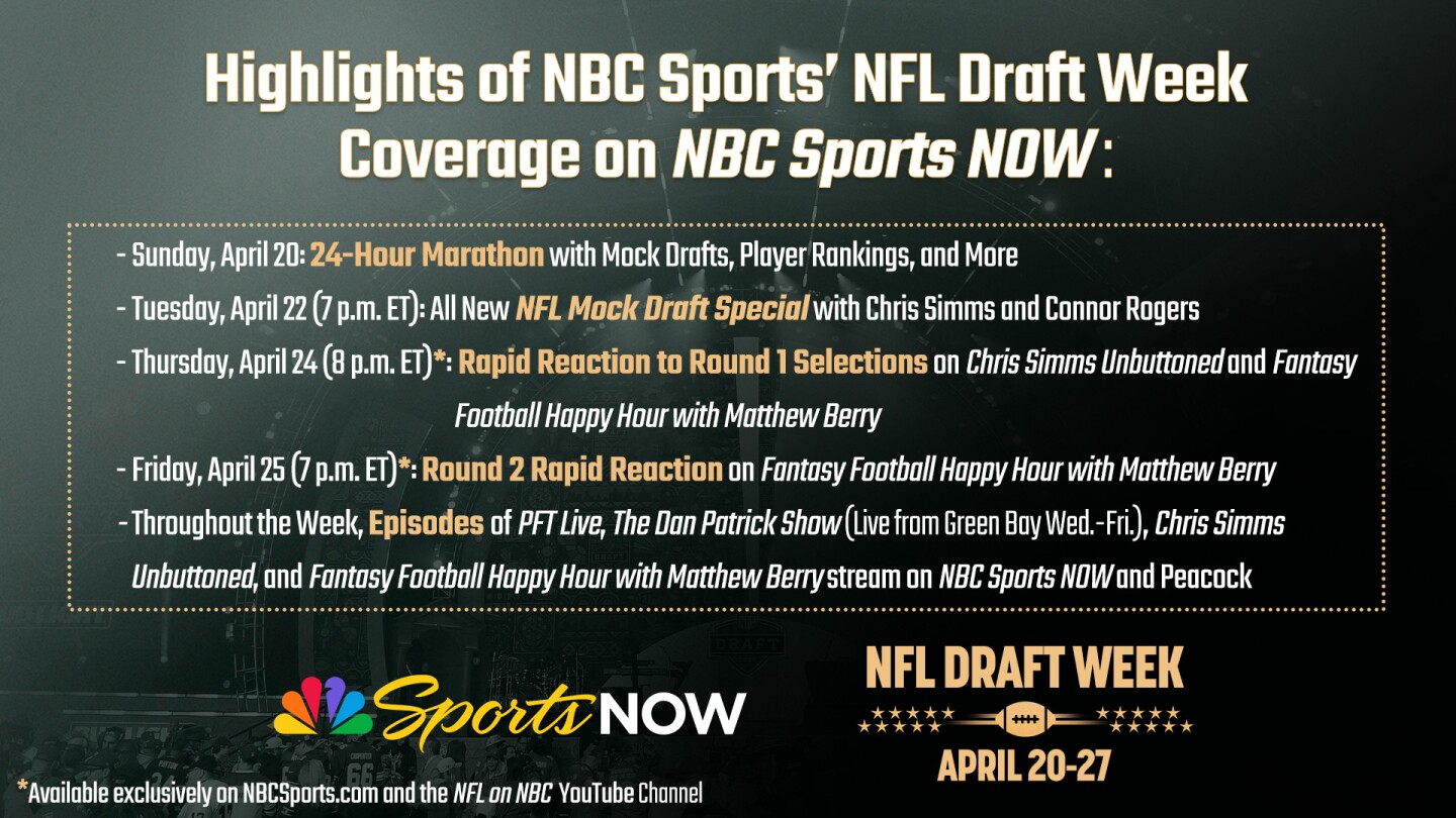 Share Twitter Facebook LinkedIn Email With one Week until the First Round of the 2025 NFL Draft, NBC Sports’ Month-Long Coverage Continues across NBC Sports NOW, Peacock, and NBC Sports Digital PlatformsRead More