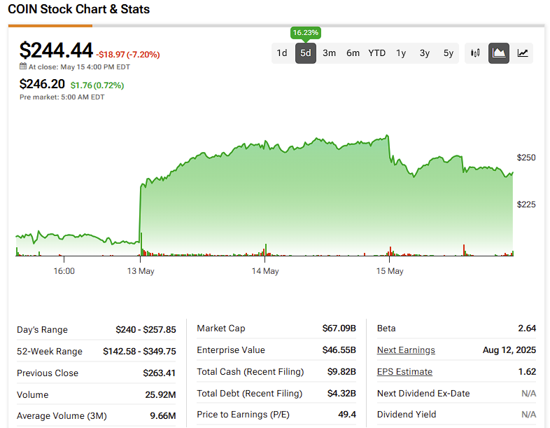 Cryptoeconomy enabler Coinbase Global (COIN) rallied 16% over the past five days to celebrate its public listing on the S&P 500 index, scheduled for next week. Coinbase’s addition to the S&P 500 marks a historic milestone as the first cryptocurrency exchange included in the index, symbolizing a step toward mainstream acceptance of crypto. This move is expected to boost institutional interest and attract new capital, especially through passive funds that must buy S&P 500 components, effectively mRead More
