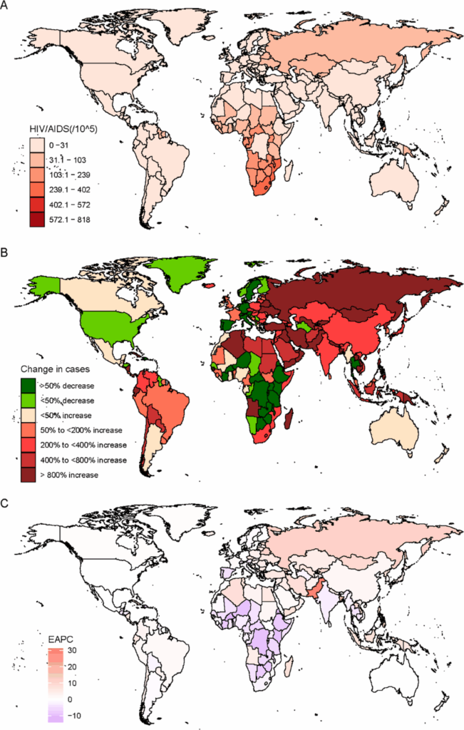 Background Few studies have focused on the descriptive epidemiology and trends of HIV/AIDS since the publication of the Global Burden of Disease (GBD) study in 2021. Therefore, this study aims to analyze the trends and patterns of the HIV/AIDS burden at the global, regional, and national levels by sex, age and social development index (SDI). We also explored risk factors and predicted the GBD of HIV/AIDS until 2030. Methods Data on the etiology of HIV/AIDS from 1990 to 2021 were collected from the 2021 GBD database. Estimated annual percent changes (EAPCs) were calculated to assess temporal trends in the age-standardized incidence rate (ASIR), age-standardized disability-adjusted life-year rate (ASDR) and age-standardized mortality rate (ASMR) of HIV/AIDS patients. Measures categorized by sex, region, age and SDI quintiles. In addition, an age‒period‒cohort model was established to forecast future trends of the HIV/AIDS burden to 2030. Results Globally, the incidence of HIV/AIDS reached 1.65 million (95% uncertainty interval 1.48 to 1.82) in 2021. From 1990 to 2021, the global ASIR of HIV/AIDS showed a downward trend, with an EAPC of 0.14% (0.12–0.16%). The ASIR, ASDR, and ASMR of HIV/AIDS were highest in the low-SDI region and lowest in the high-SDI region. Regionally, southern sub-Saharan Africa had the highest ASIR in 2021, whereas Oceania had the largest increase in the ASIR from 1990 to 2021. Burundi (EAPC 14.04%, 95% CI -13.63 to -14.44%), followed by Burkina Faso, exhibited the most significant decrease in the ASIR. Globally, the highest incidence rate was observed in the 25–29 years old group. Unsafe sex is the primary factor leading to the burden of HIV/AIDS. By 2030, the global ASIR, ASDR and ASMR of HIV/AIDS are expected to gradually decrease. Conclusion HIV/AIDS disease burden varies by region, sex, and age. The global burden of HIV/AIDS is substantial in low-income regions, especially in Sub-Saharan Africa. Our study offers valuable epidemiological evidence for future research on the prevention and treatment of HIV/AIDS.Read More