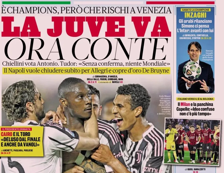 Share Twitter Facebook LinkedIn Email La Gazzetta dello SportIt’s Champions, but many risks in VeniceJuve go, now it’s Conte’s timeChiellini votes for Antonio. Tudor: ‘If I’m not confirmed, no World Cup.’ Napoli want to close …Read More