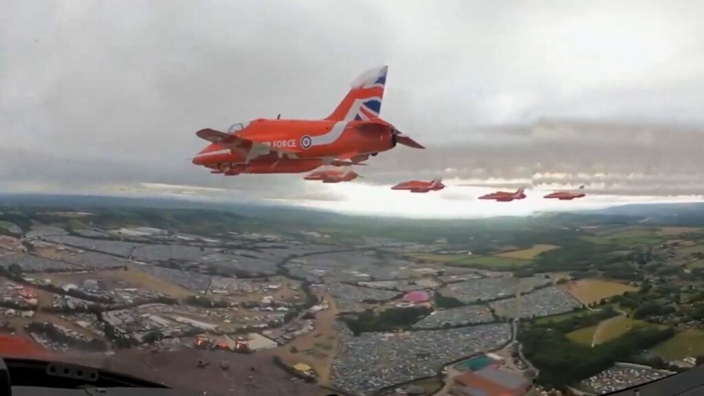 Share Twitter Facebook LinkedIn Email The Royal Air Force aerobatic team, the Red Arrows, performed a flyover above Glastonbury Festival as British rock band Pulp performed their hit song Common People.Read More