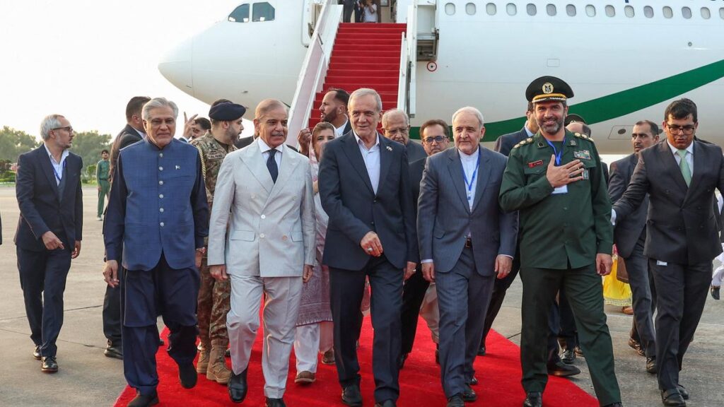 Share Twitter Facebook LinkedIn Email Iranian President Pezeshkian visits Pakistan to boost ties and increase trade volume, warmly welcomed by high-ranking officials.Read More