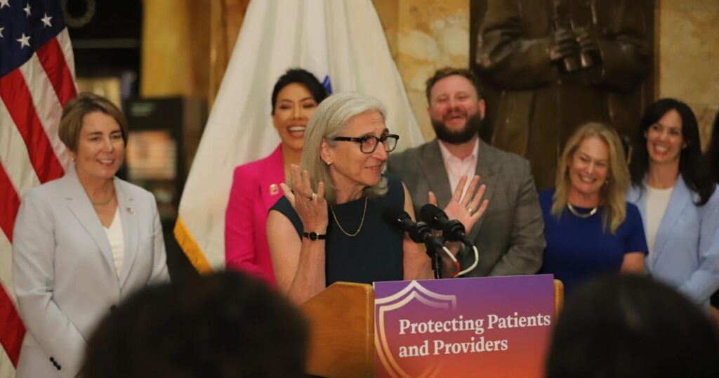 Share Twitter Facebook LinkedIn Email Sen. Cindy Friedman, co-chair of the Committee on Health Care Financing, speaks at a press conference before Gov. Maura Healey signs the 2025 “shield” bill into law at the StateRead More