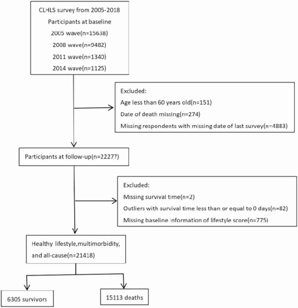 Background Unhealthy lifestyles and multimorbidity are major determinants of adverse health outcomes in later life. However, the potential benefits of adhering to a healthy lifestyle among older people with multimorbidity remain unclear. This study aimed to evaluate the independent and joint associations of healthy lifestyle, multimorbidity, and all-cause mortality risk. Methods We used data from the 2005–2018 waves of the Chinese Longitudinal Healthy Longevity Survey (CLHLS), including participants aged 60 years and older. Healthy Lifestyle Index (HLI) was constructed based on five modifiable factors: body mass index (BMI), smoking status, alcohol consumption, physical activity, and dietary intake. Multimorbidity was defined as the presence of two or more chronic conditions. Cox proportional hazards regression was employed to assess the associations between healthy lifestyle, multimorbidity, and all-cause mortality, with stratified analyses by age, sex, and urban–rural residence. Results A total of 21,418 participants were included, with 15,113 deaths recorded over a median follow-up of 3.44 years (IQR 1.90–6.77). The age- and sex-adjusted mortality rate was 149.19 per 1,000 person-years (95% CI: 147.90–150.49). Among the lifestyle factors, physical activity showed the strongest association with reduced mortality (HRd=0.68, 95% CI 0.65–0.71; pRead More