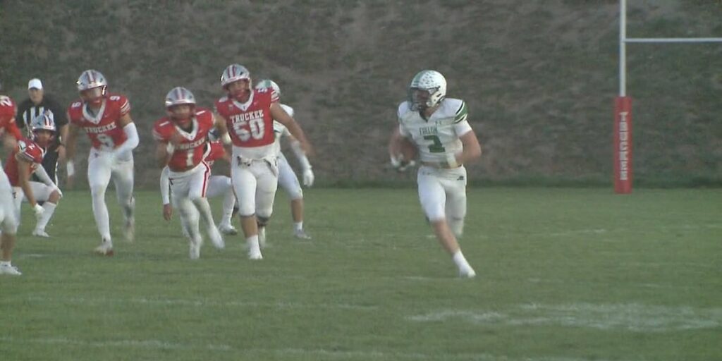 Share Twitter Facebook LinkedIn Email Churchill County’s Carson Melendy breaks away from Truckee’s defense to help the Greenwave beat the Wolverines 42-0Read More