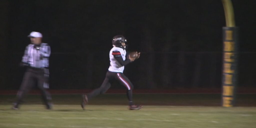 Share Twitter Facebook LinkedIn Email Pershing County’s Trenton Rhodes celebrates a punt return touchdown against Incline as the Mustangs beat the Highlanders 46-0Read More