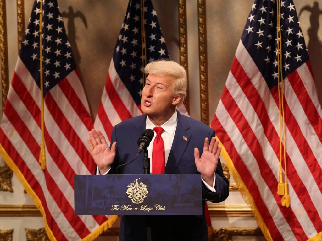 Share Twitter Facebook LinkedIn Email James Austin Johnson returned as President Donald Trump while Colin Jost played Defense Secretary Pete Hegseth.Read More