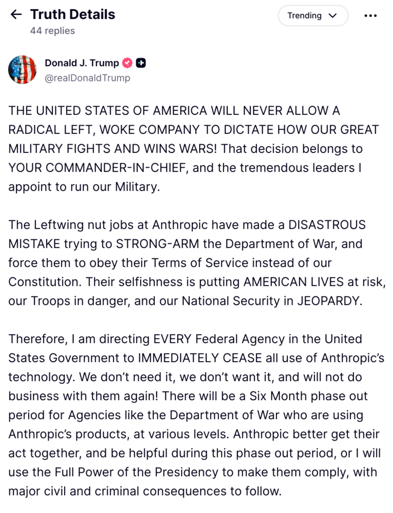 Share Twitter Facebook LinkedIn Email Trump demands government stop using Anthropic’s AI technology.Read More