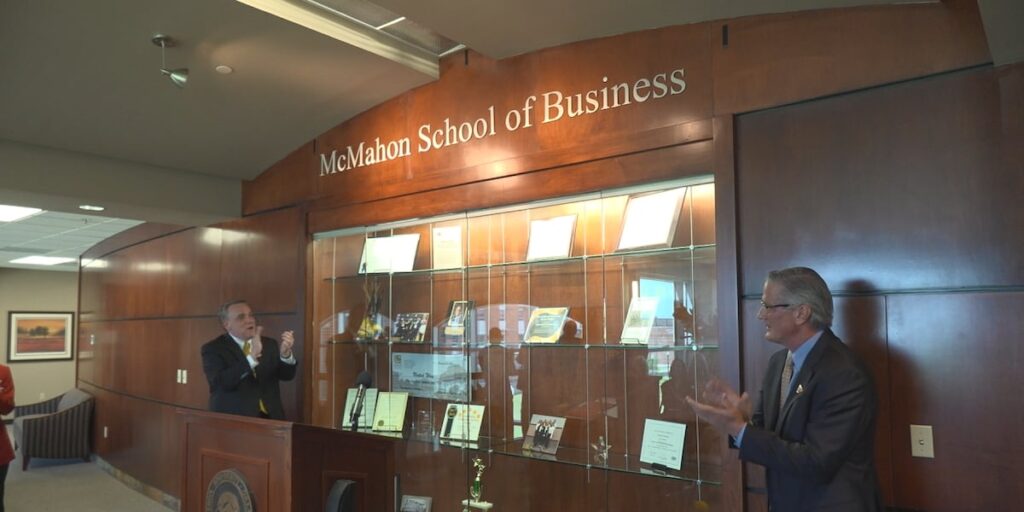Share Twitter Facebook LinkedIn Email Cameron University unveiled the McMahon School of Business on Wednesday, backed by the largest naming gift in the university’s history.Read More