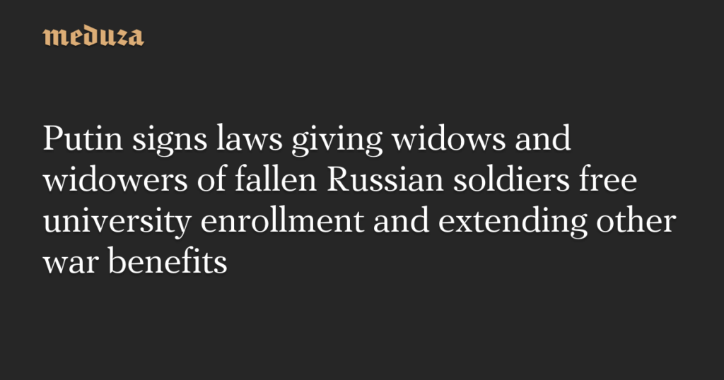 Putin signs laws giving widows and widowers of fallen Russian soldiers free university enrollment and extending other war benefits